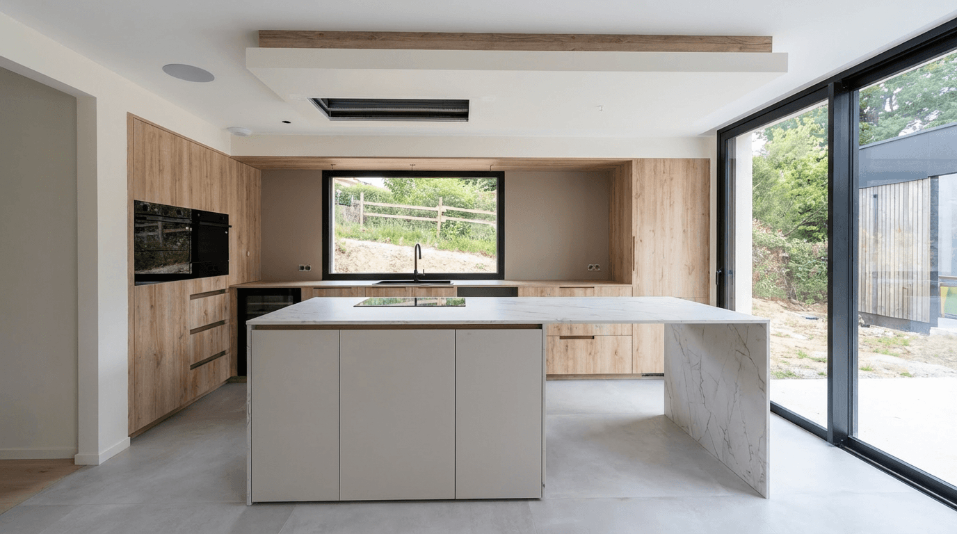Travaux réalisés à Guichen. Réalisation de placo sur mesure pour l’aménagement de la cuisine, avec des ajustements précis pour un rendu net et bien aligné. Particularité du chantier, un coffrage plafond sur mesure pour intégrer la hotte et l’éclairage, avec une finition propre et discrète.